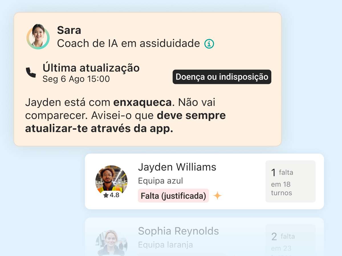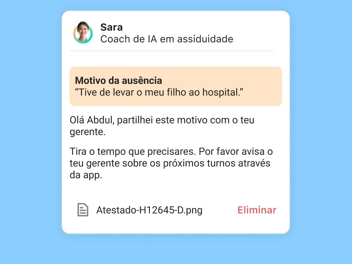 A Sara é uma assistente de assiduidade com IA que avisa automaticamente quando um trabalhador não faz o registo de ponto na aplicação. Ela liga para o trabalhador, pergunta o motivo e compartilha o resultado com o gestor, tudo em tempo real.