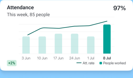 A plataforma disponibiliza dados que permitem tomar decisões informadas sobre a equipa. Desta forma, pode analisar as tendências de assiduidade, planear os turnos com mais precisão e ajustar rapidamente a equipa em resposta às necessidades operacionais, o que conduz a uma maior eficiência e poupança de custos.