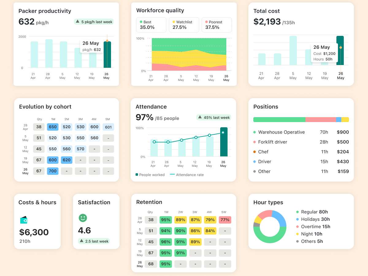 Dê feedback e classificações em tempo real para melhorar a qualidade do desempenho de um trabalhador e conheça os seus melhores desempenhos.